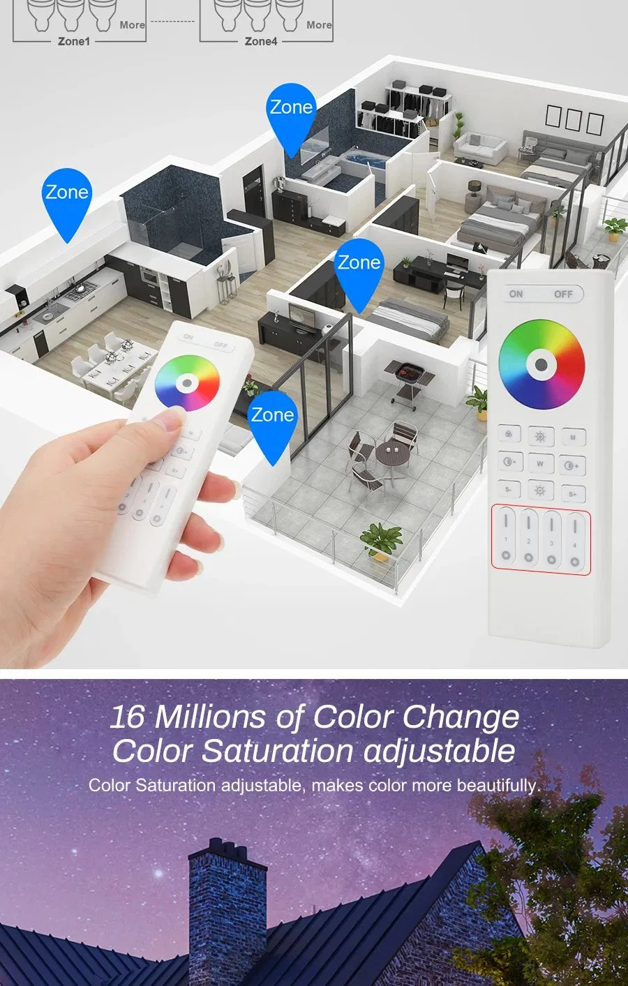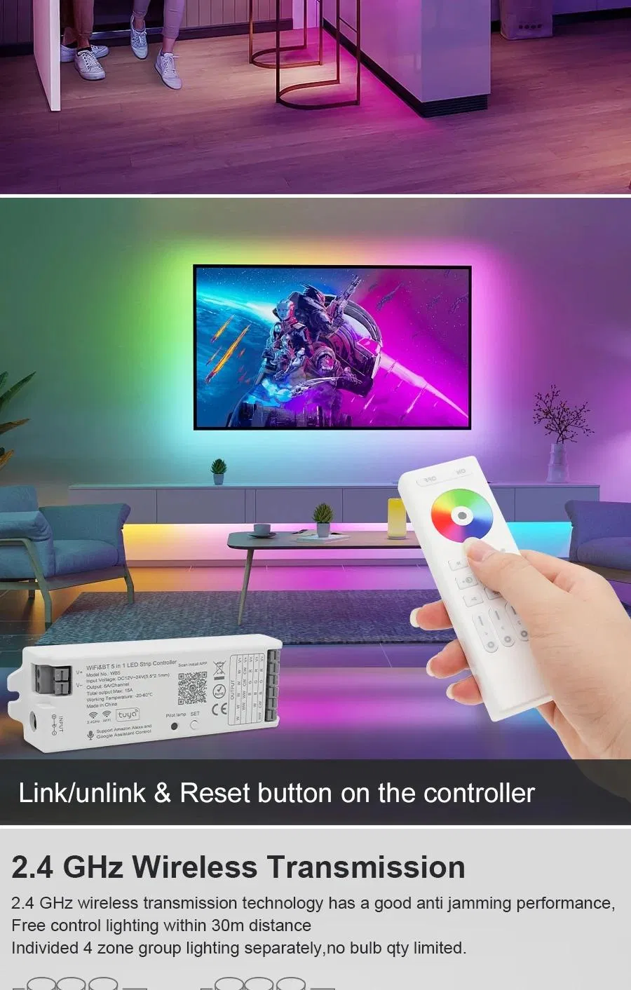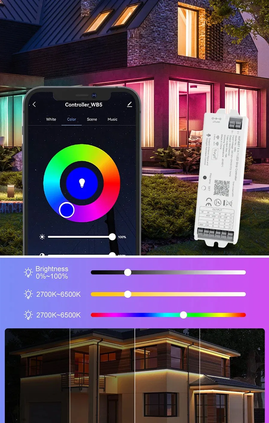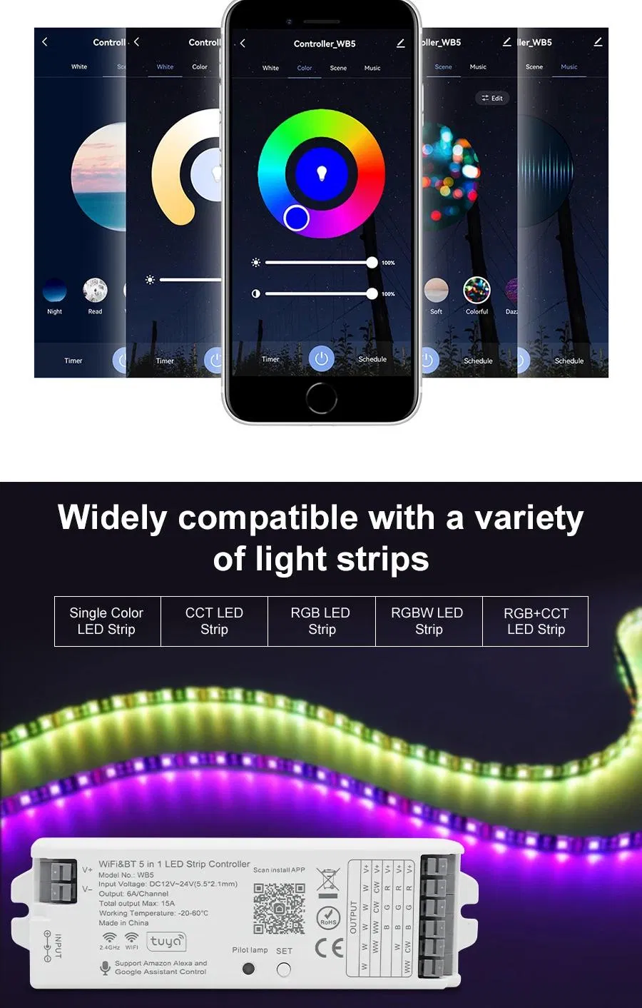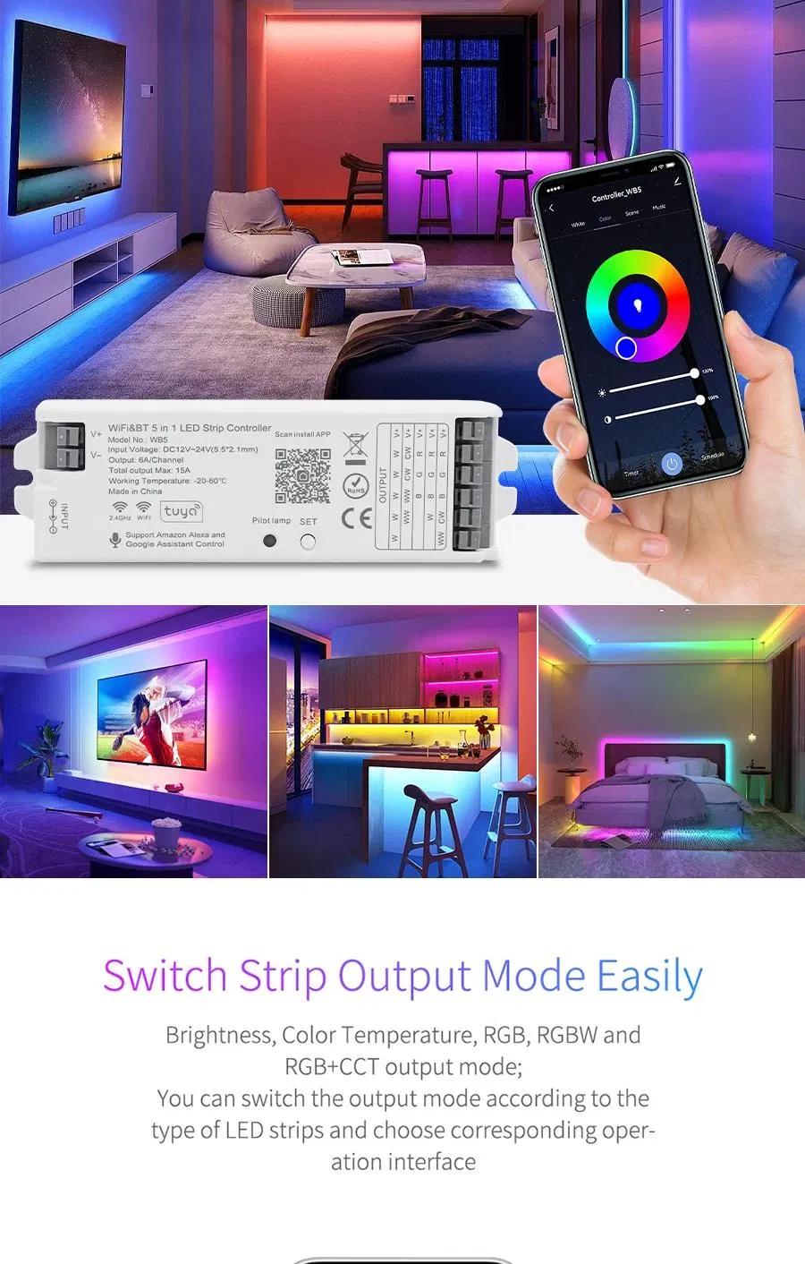 5-in-1 Smart LED Dimmer: A versatile intelligent controller supporting multiple output modes including Single Color, CCT, RGB, RGBW, and RGBCCT. Compatible with both SMD and COB LED strips via PWM control.